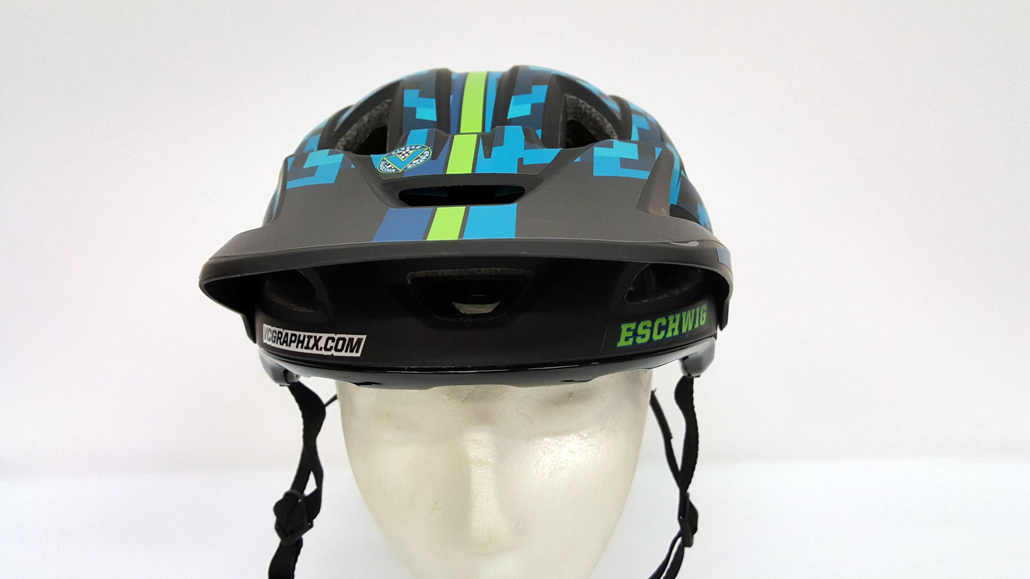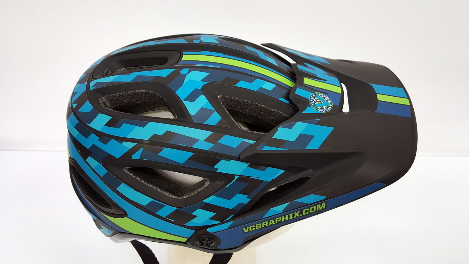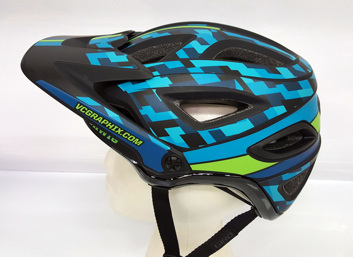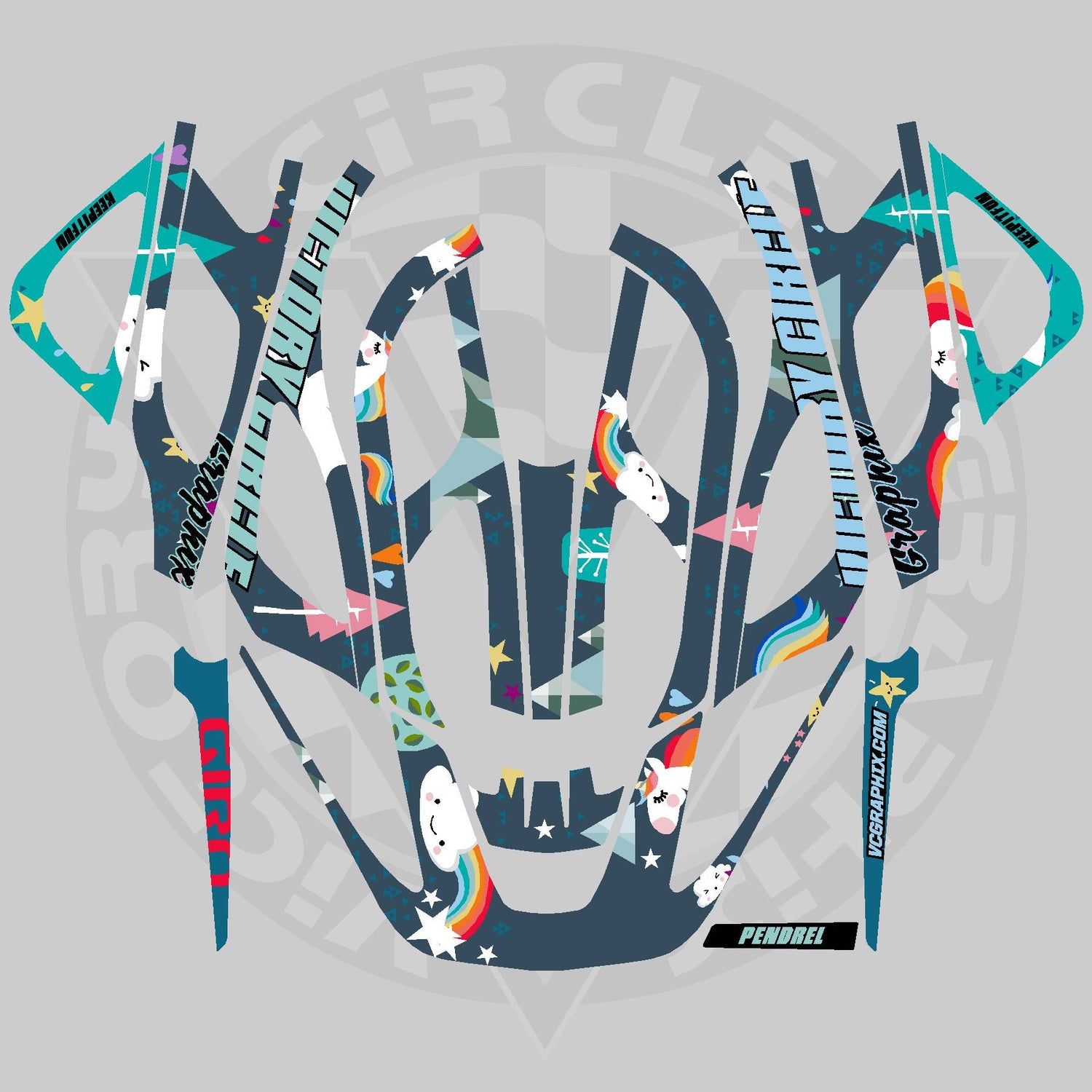 Giro Montaro helmet kit. Design elements from the Catharine Pendrel Rainbows and Unicorns kit from Garneau clothing. #KeepItFun Inspired to Keep It Fun, and, hey, riding mountain bikes should be fun and helmets with visors are cool. Easy to install with a custom air bubble free adhesive. Please note some of your existing helmet color will show through, so we generally recommend a white or black stock helmet color. Kit comes in sections, so you can install as much or as little as you prefer. Includes a custom name sticker to install under the visor above eye brow. Choice of matte or gloss finish. Cool way to dress up and personalize your mtb helmet. As it gets scratched up over time, just peel it off and install a new one. Please note other photos show a different kit for reference on how the sections install.